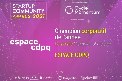Nouvelles 03 décembre 2021 Espace CDPQ lauréat du prix « Champion corporatif de l’année 2021 » au gala de la communauté Startup